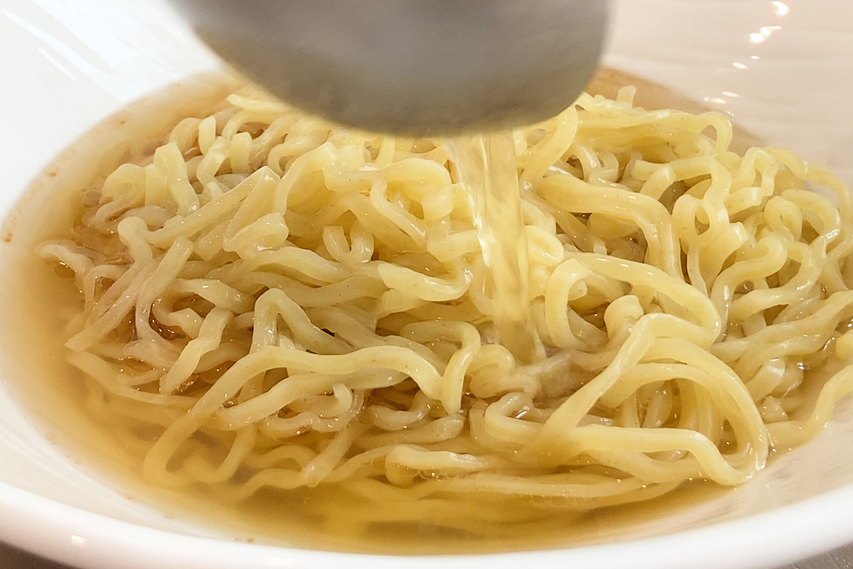 • Start each serving bowl with a spoonful of soy sauce tare, then add a drizzle of sardine-infused oil to deepen the flavor. Add the cooked noodles, and carefully pour in the hot broth until it reaches just below the top of the noodles. This keeps the noodles slightly elevated and ensures a balanced bowl without overflowing.