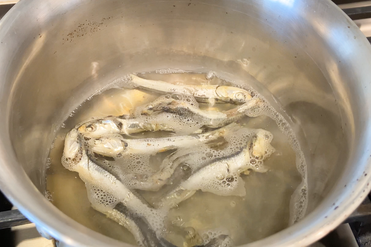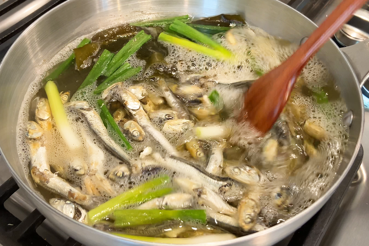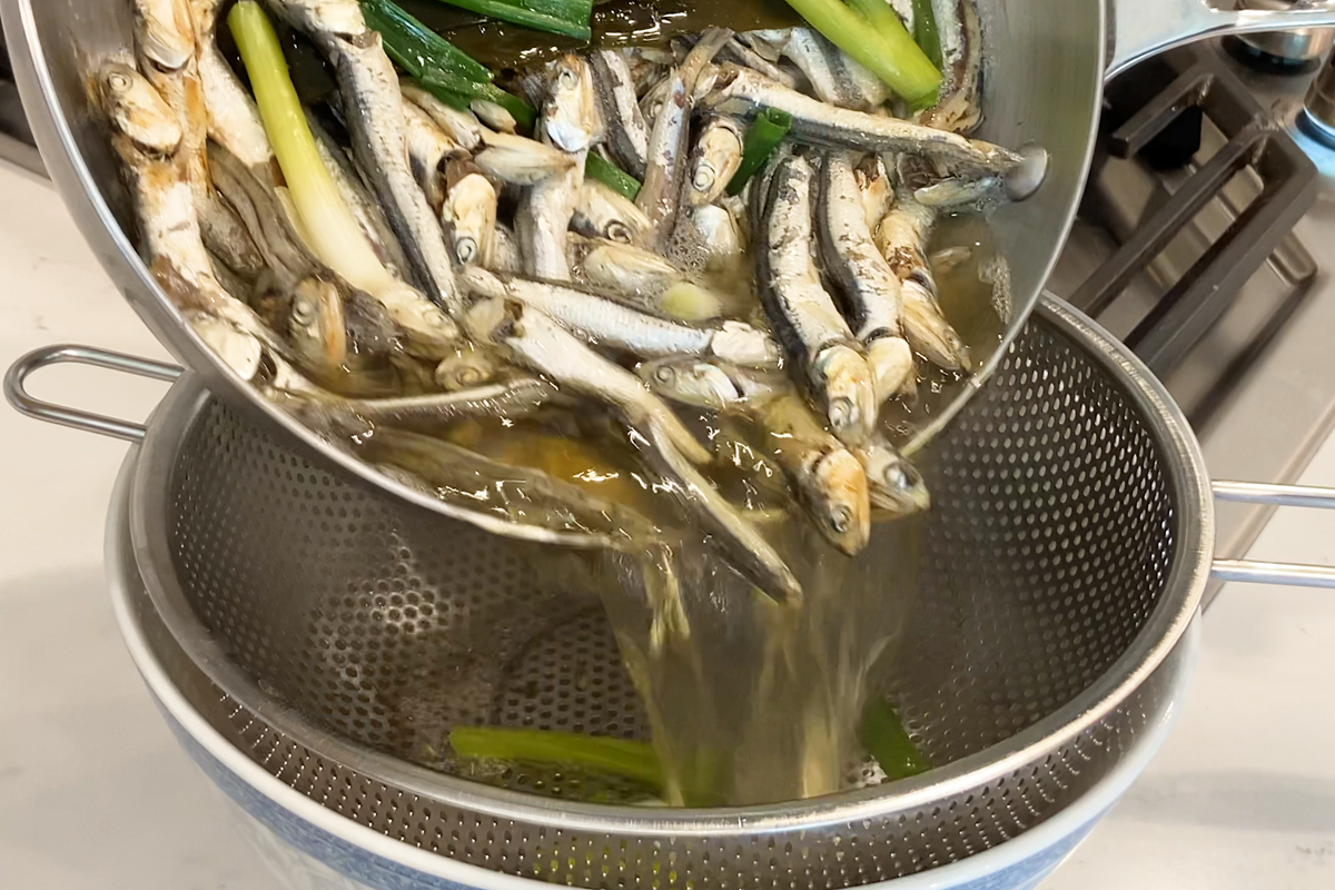 • In a small pot or bowl, soak dried sardines in water for at least one hour. After soaking, place the pot over very low heat and allow the mixture to slowly come to a boil, which should take around 45 minutes. Once it reaches a boil, strain out the sardines and reserve the flavorful stock.