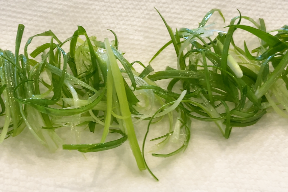 • Finely slice the green parts of your scallions into thin strips. Place them in a bowl of ice water with a few ice cubes.