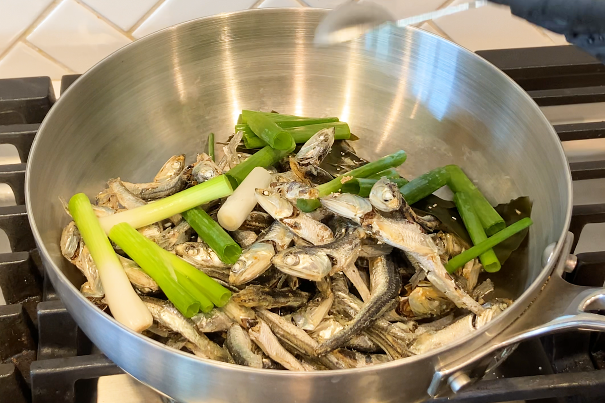 • In a large pot, combine dried small sardines, pieces of kombu, and chopped green onions. Add water and a bit of Hon-dashi if you'd like a stronger umami flavor.