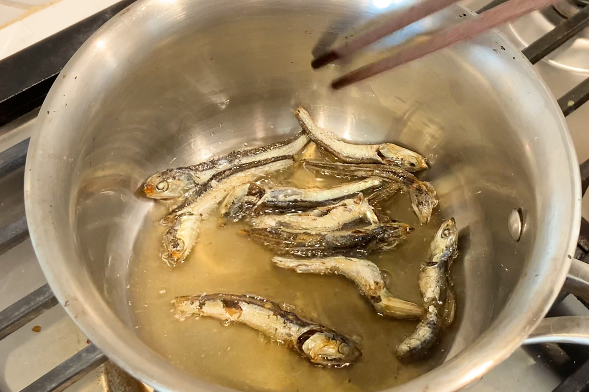 • Heat lard or a neutral oil in a pan over low heat. Add dried sardines and fry them gently for about ten minutes until they turn golden and crispy.
