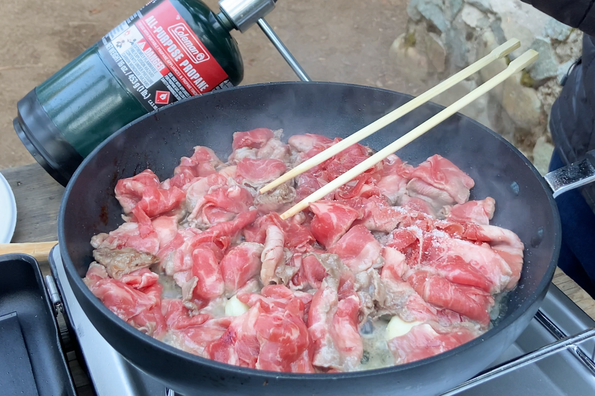• Use thin-sliced beef for quick searing — It cooks fast and stays tender, making it ideal for uneven camp-stove heat.