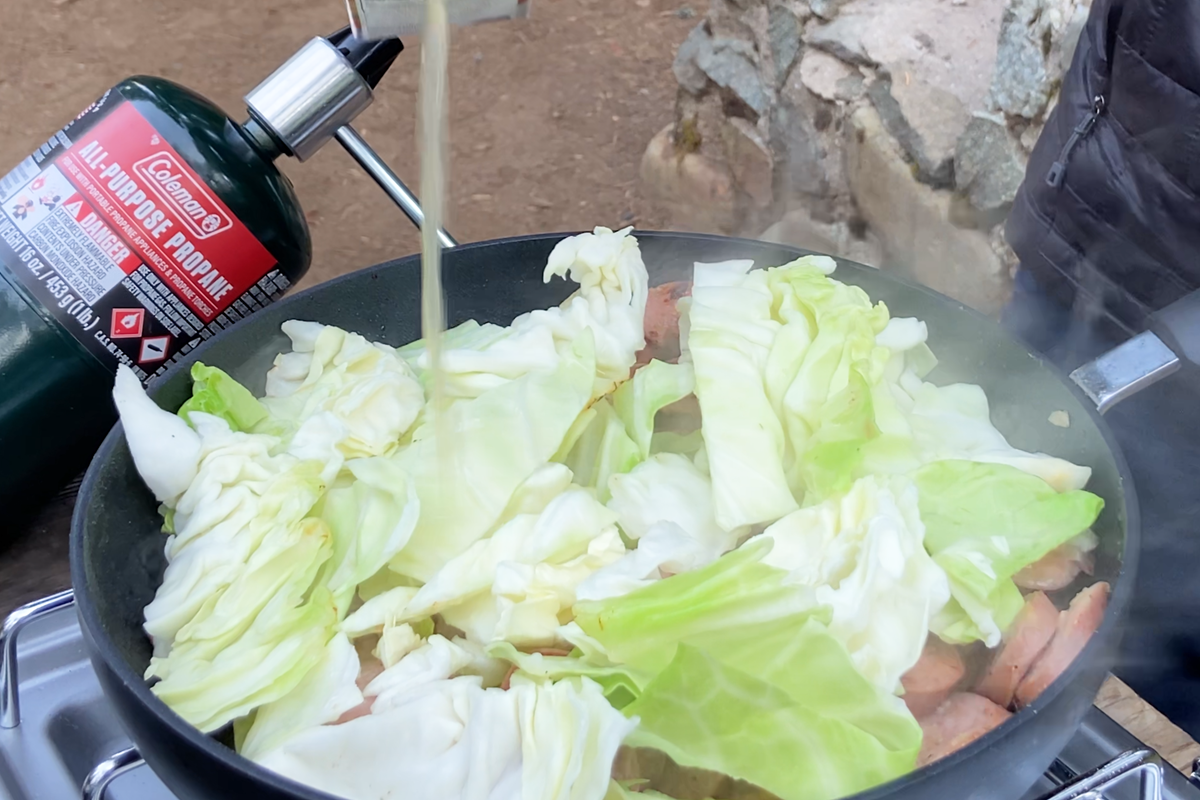Keyword buttery sausage and cabbage stir fry, cabbage stir fry camping recipe, campfire stir fry, camping meals with sausage, easy camping cooking, outdoor cooking recipe, sausage and cabbage recipe, skillet sausage and cabbage