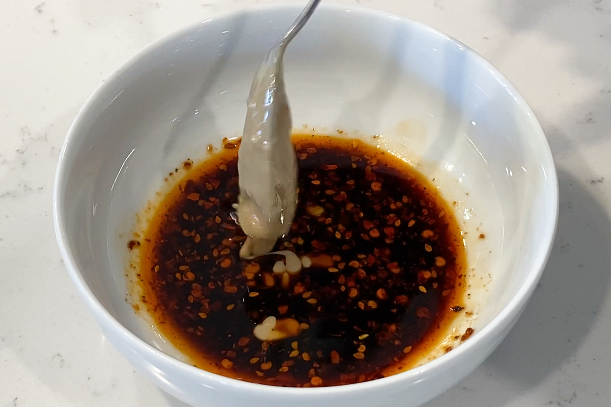 • Mix the Seasoning Sauce: In a bowl, whisk together soy sauce, dark soy sauce, rice wine, sesame oil, chili crisp, and sesame paste until smooth and glossy.