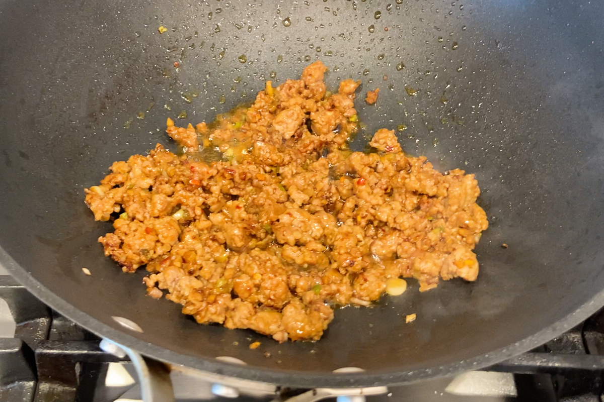 • Cook the Pork: Add the ground pork, breaking it apart as it cooks. Season with white pepper and salt, and stir-fry for 5–7 minutes, until browned and little caramelized bits develop.