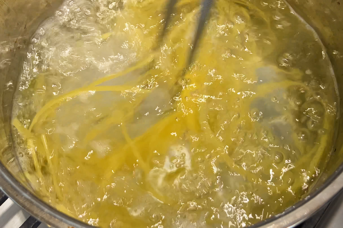 Cook the pasta for Shrimp Pasta with Crispy Anchovies