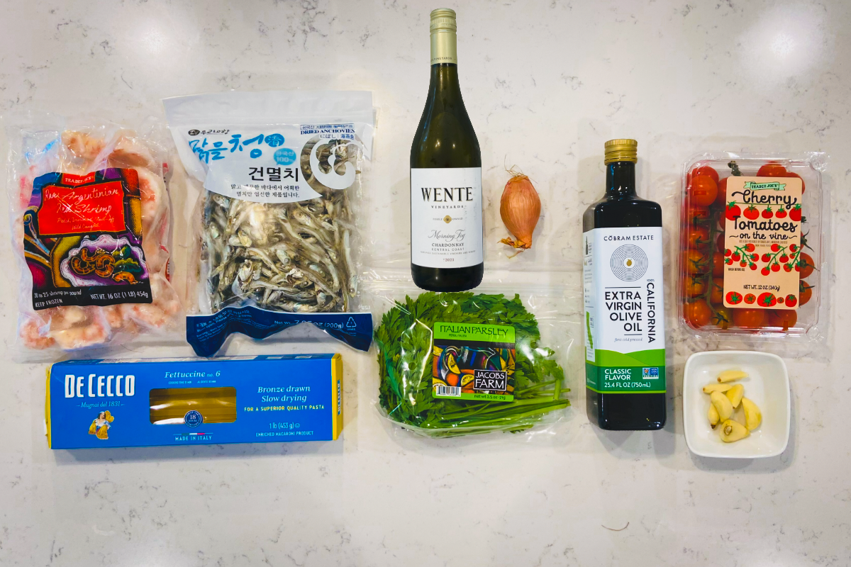 The magic of this dish lies in the anchovy oil. By gently frying dried anchovies in avocado oil until they’re crisp and golden, you create a oil that becomes the soul of the sauce. The crispy anchovies are set aside as garnish, while the oil infuses the pasta with layers of savory depth. Add shrimp, garlic, scallions, and sweet cherry tomatoes, and you’ve got a pasta dish that’s both healthy and satisfying.