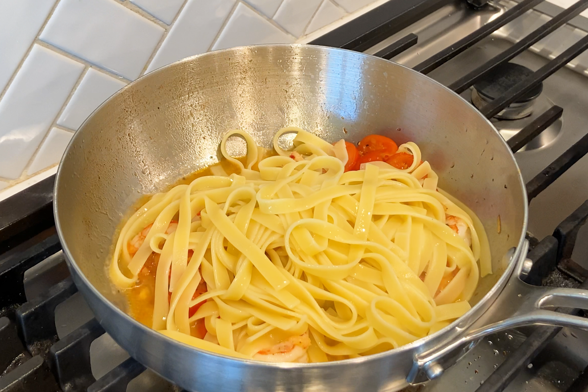 • Bring It All Together: Return the shrimp to the pan and stir to coat with the sauce. Transfer the pasta straight from the pot into the pan. Add a splash of reserved pasta water and toss for 1–2 minutes, until the sauce clings to the noodles and looks glossy.