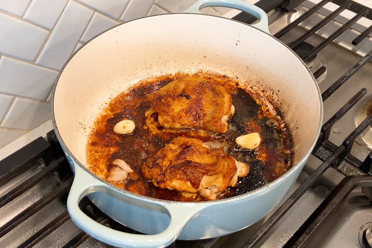 - Add the Sauce: Pour in the prepared glaze and add the garlic cloves. Cover and cook for 2 minutes, then flip the chicken, cover again, and cook 2 more minutes. The sauce should now be glossy and coat the chicken beautifully.