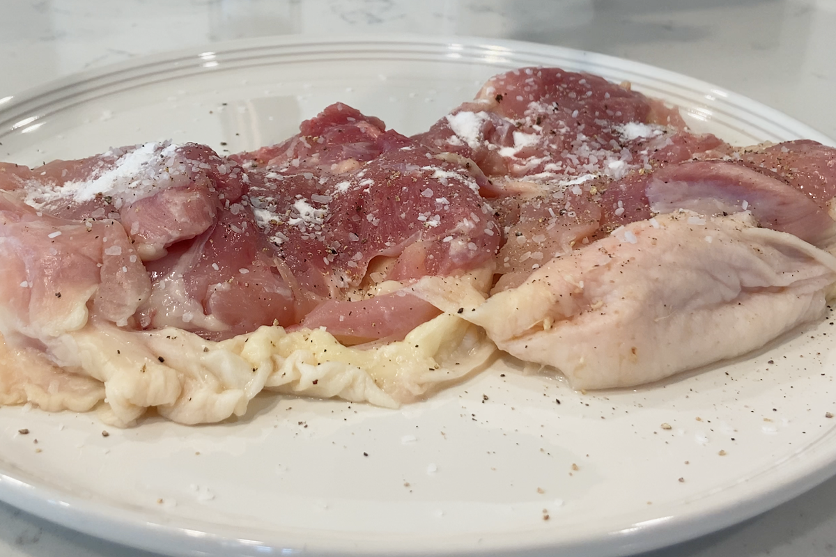 - Prepare the Chicken: Season both sides of the chicken with salt and pepper. Lightly coat with potato starch and press it down so it sticks—this helps the chicken develop a beautiful golden crust.