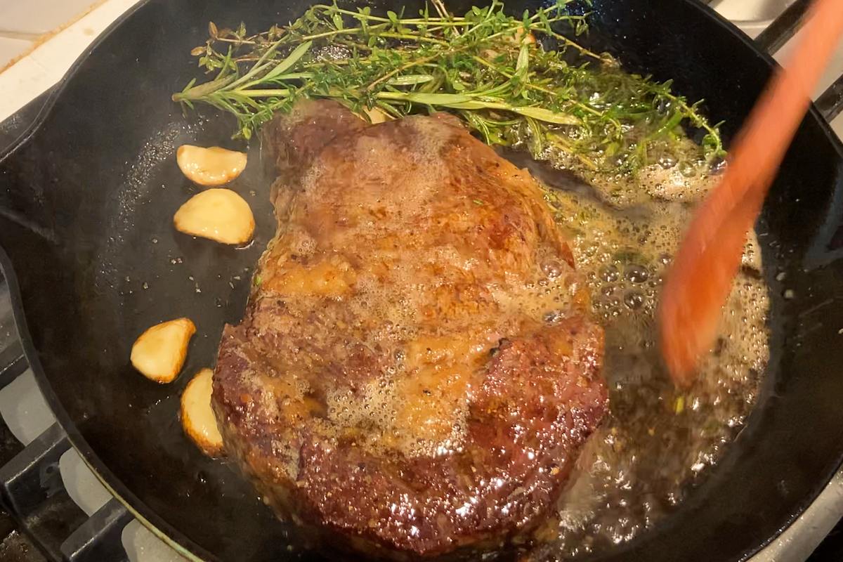 - Add Aromatics and Baste: Add butter, garlic, thyme, and rosemary. Tilt the pan and baste the steak repeatedly for 20–30 seconds. The butter will foam, the herbs will sizzle, and the smell will fill your kitchen.